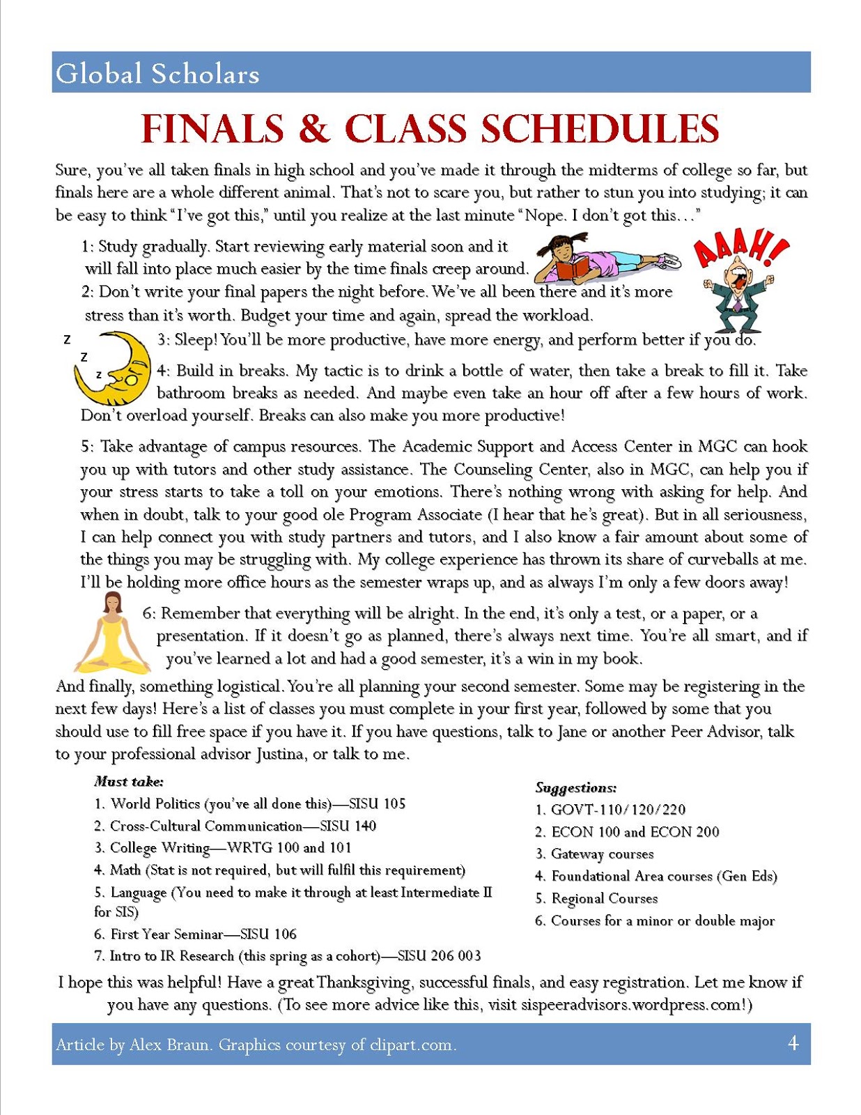 As I mentioned above, graduating early took a lot of logistical coordination and self-motivation to get everything together. I really had to put the pieces together and make it work, because there were a lot of instances where I got so far in the planning process and then ran into an obstacle. For example, even after I had scraped together the classes for the summer and fall that met the requirements for my major and the Honors Program – and still interested me – one of my regional classes for SIS was cancelled three days before the first day of classes. I tried to do an independent study, and had all of the pieces in place for that, but unfortunately it didn’t work out. Instead, I was forced to reshuffle my schedule again, and the new class didn’t allow for me to have an internship during the week (it was aMonday-Thursday, 1:10-2:25 p.m. class). I had to sacrifice having an internship the semester I was graduating, and it took me a while to come to terms with that reality. In the end, it was worth it. However, I think I made it work because I have always tended to plan ahead, and I was blessed to be able afford to take Advanced Placement classes in a high school with a multitude of options and a variety of resources.